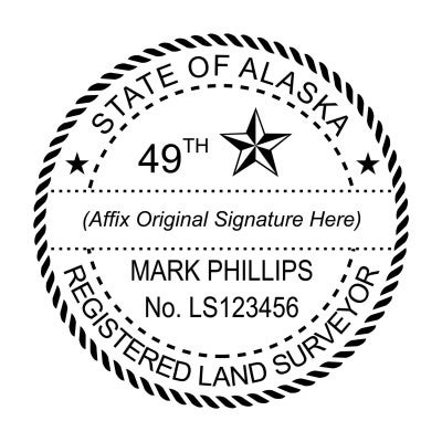 This State of Alaska Registered Land Surveyor Seal has customization options including product type and size (choose from stamp or embosser), ink color, foil embossing stickers and more.