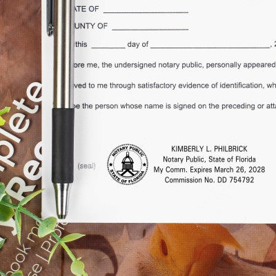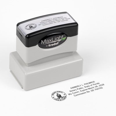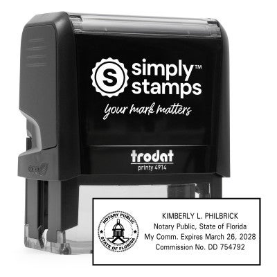 Our Florida Rectangle Notary Stamp complies with the updated Florida-approved stamp seal design. Order your Florida Rectangle Notary Stamp as either a rubber stamp or embosser and enter the required information to personalize your seal.