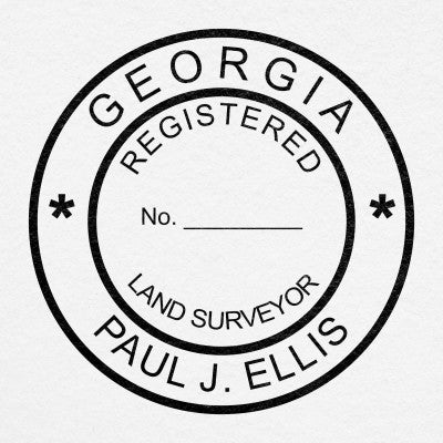 This State of Georgia Land Surveyor Seal has customization options including product type and size (choose from stamp or embosser), ink color, foil embossing stickers and more.