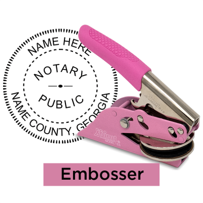 Our Georgia Pink Round Notary Seal complies with the updated Georgia-approved stamp seal design. Order your Georgia Pink Round Notary Seal as either a stamp or embosser and enter the required information to personalize your seal.