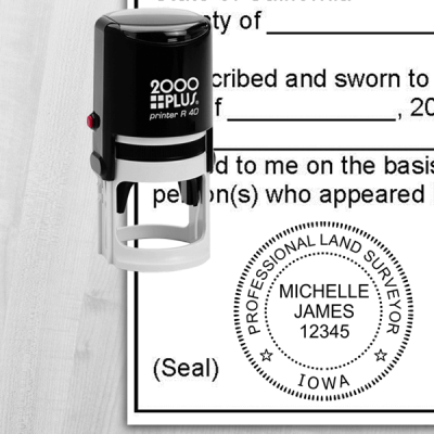 This State of Iowa Land Surveyor Seal has customization options including product type and size (choose from stamp or embosser), ink color, optional ink refill bottle, foil embossing stickers and more.