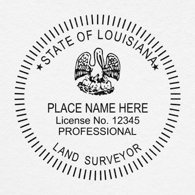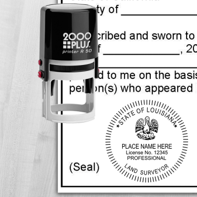 This State of Louisiana Land Surveyor Seal has customization options including product type and size (choose from stamp or embosser), ink color, foil embossing stickers and more.