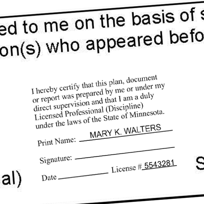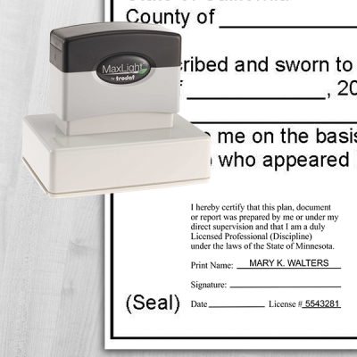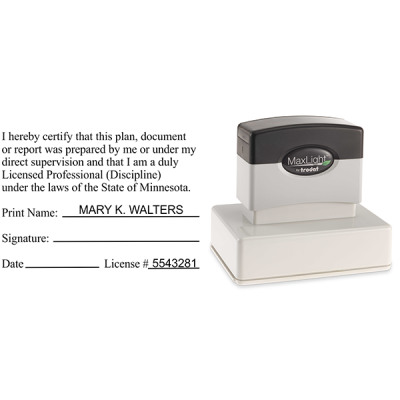 Our Minnesota Plan Certification Stamp for all Disciplines complies with the up-to-date Minnesota-required seal design. Order your Minnesota Plan Certification Stamp for all Disciplines as a traditional wood-handle, self-inking, or pre-inked stamp and enter the required information.