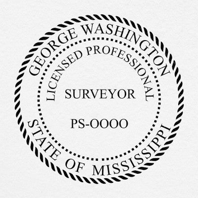 This State of Mississippi Surveyor Seal has customization options including product type and size (choose from stamp or embosser), ink color, foil embossing stickers and more.