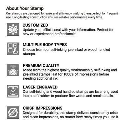 When is the last time you updated your professional seal? Our products meet current state recommendations and will be customized with your name, license number and/or other required information set by the State of Mississippi.