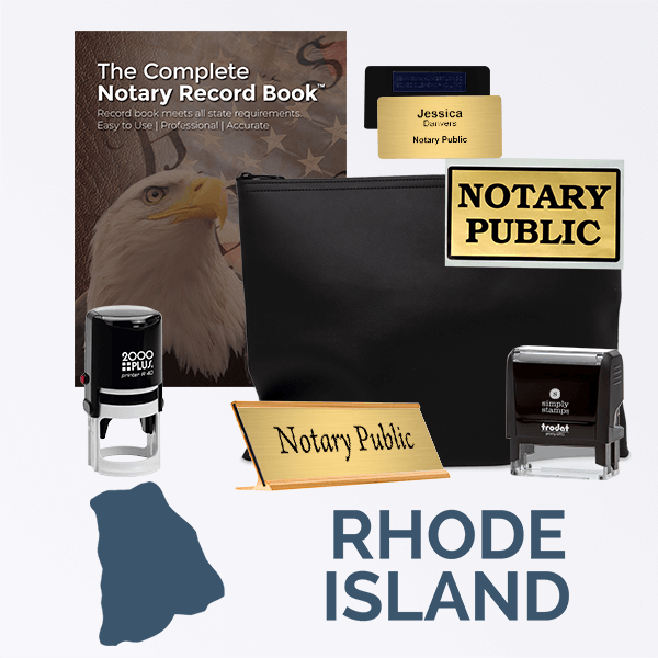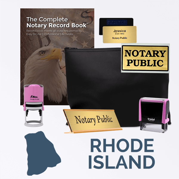 Our notary accessories include notary records books, notary public decals, personalized notary desk plates, notary public name tags, and more! Choose one of our complete notary kits that include everything you need to get started. Our notary stamps are designed to meet Rhode Island notary requirements, including State of Rhode Island stamps with your name as it appears on your application for appointment. Once your commission has been verified by your secretary of state, your order will ship next business day.