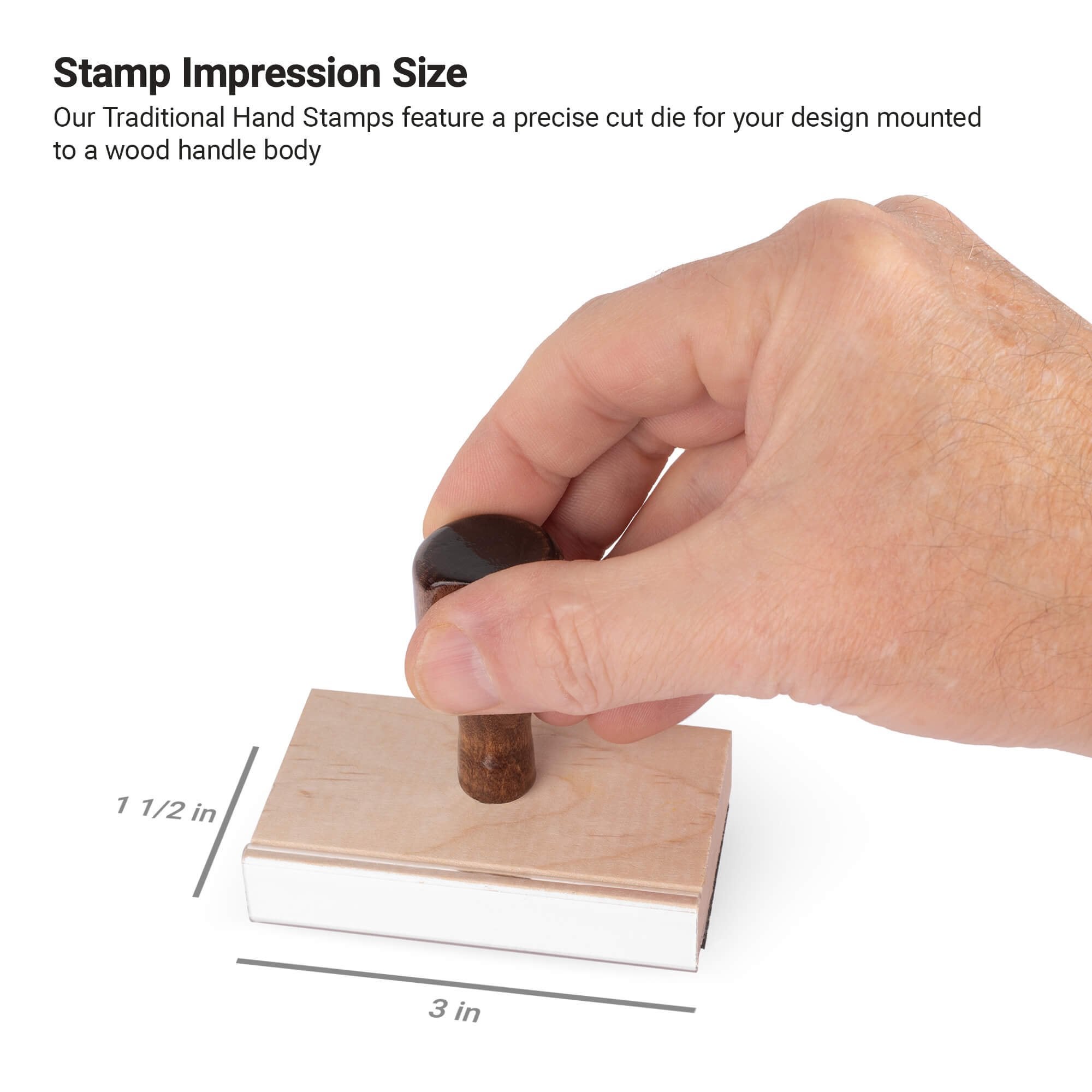 Design your own custom 1 1/2" x 3" Traditional Hand Stamp from Corp Connect. Perfect for personal or professional use, you can make a rubber stamp with custom text and images to fit you or your business' needs.