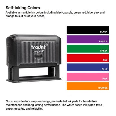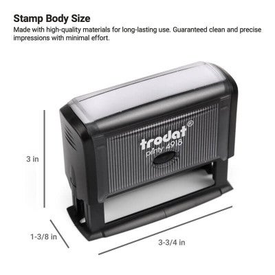 Trodat 4918 Stamp Details Exclusively the very best for our awesome buyers! This specific Trodat 4918 is for you! The same high quality and preciseness of results you’ve come to recognize and love – we have just what you need! For years the Trodat 4918 stamp has served their client base as an industry leader for years and has satisfied their millions of customers. These self inking stamps are a breeze to use and are just about mess free! On our part, we test each and every stamp to make certain that we are staying true to the pledge that the manufacturer upholds for excellence. Every single self inking stamp is hand assembled and prepared in our Florida factories! Order yours here!