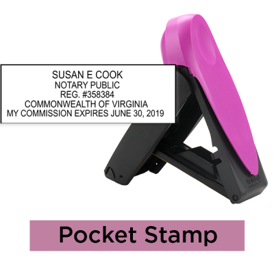Our Virginia Pink Rectangle Notary Stamp complies with the updated Virginia-approved stamp seal design. Order your Virginia Pink Rectangle Notary Stamp as either a self inking stamp or pocket stamp and enter the required information to personalize your impression.